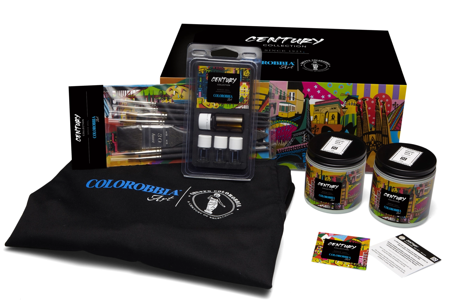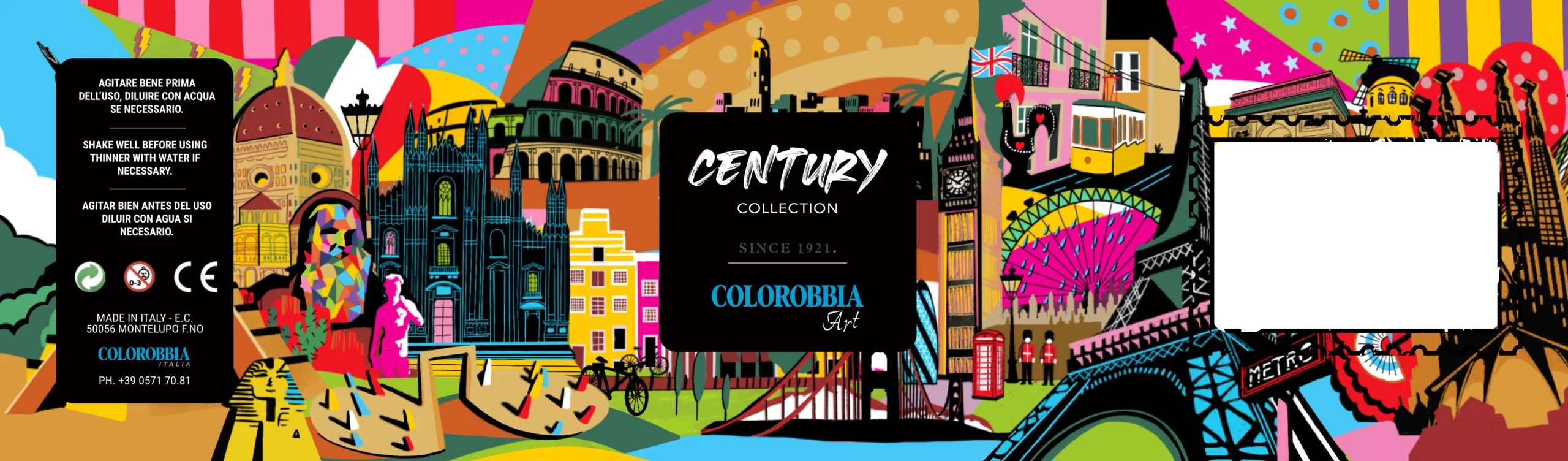 In Century, il packaging non è un semplice contenitore ma parte integrante del progetto creativo. Ogni barattolo è avvolto da un design che racconta il viaggio globale della collezione: un’etichetta coloratissima ispirata alla Pop Art e ai monumenti delle 100 città legate alla rete di distributori Colorobbia.